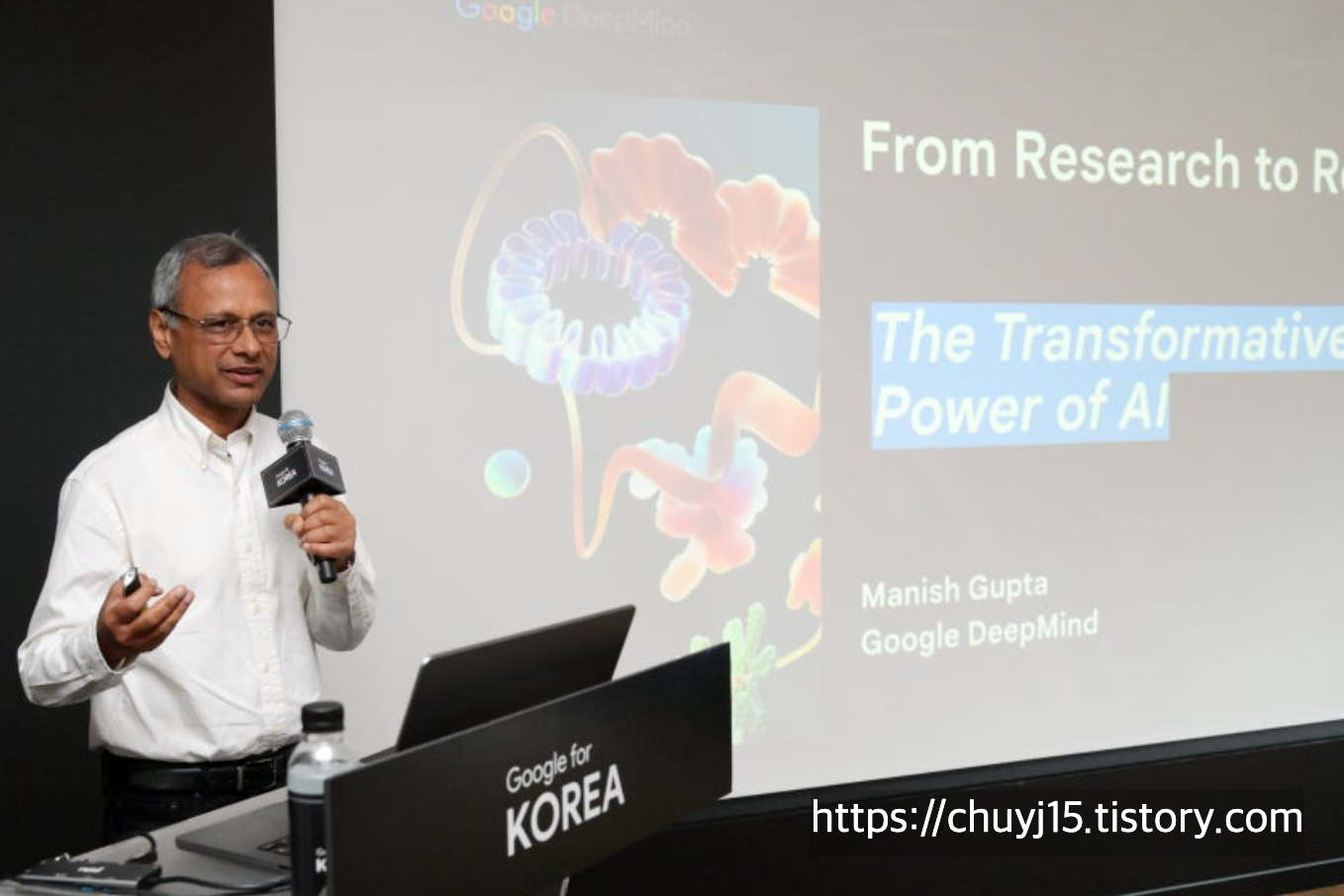 마니시 굽타 디렉터님은 구글 딥마인드가 개발한 '알파폴드'라는 단백질 구조 예측 시스템을 예로 들면서 AI의 놀라운 잠재력을 설명하셨어요.